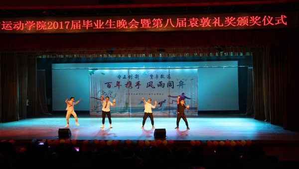 2017年6月16日,体育与运动学院“百年携手 风雨同舟”毕业生晚会在学生活动中心举行。学院全体党政领导班子及部分教师共30余人出席、2017届全体毕业生及各年级学生参加了晚会。晚会由胡丹洋,孙静秋,侯闻迪,关凯凯4位同学主持。
